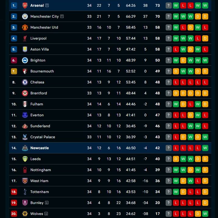 Hasil ini membawa Arsenal kembali ke puncak klasemen dengan koleksi 73 poin. Sementara itu, Newcastle harus tertahan di papan bawah dengan 42 poin.