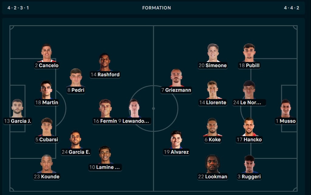 Barcelona (4-2-3-1): Joan Garcia; Eric Garcia, Cubarsi, Gerard Martin, Joao Cancelo; Olmo, Pedri; Yamal, Fermin Lopez, Rashford; Lewandowski