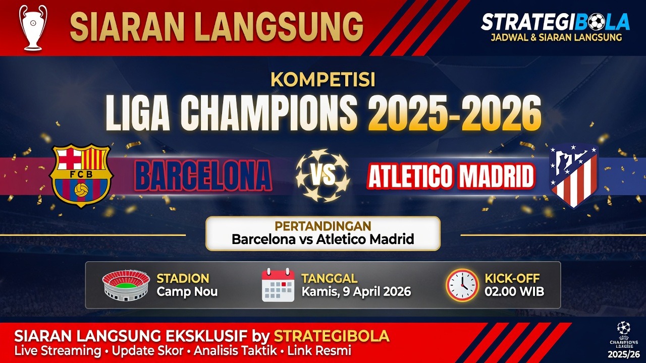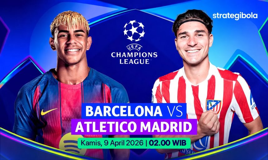Strategibola – Barcelona akan menghadapi Atletico Madrid dalam laga krusial leg pertama perempat final Liga Champions 2025-2026. Pertandingan ini akan berlangsung di Camp Nou pada Kamis, 9 April 2026 pukul 02.00 WIB.