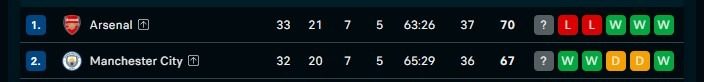 Dengan selisih gol dan jumlah gol yang sangat tipis (City 65 gol, Arsenal 63 gol), setiap pertandingan menjadi sangat krusial.