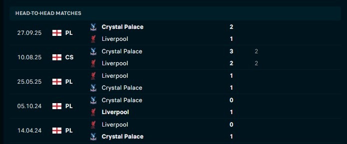 Head to Head Liverpool vs Crystal Palace (5 Pertemuan Terakhir)