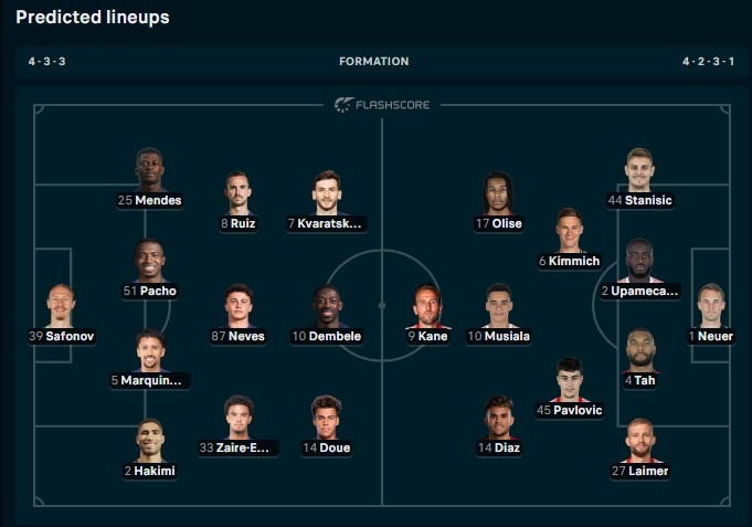 Safonov; Hakimi, Marquinhos, Pacho, Mendes; João Neves, Zaïre-Emery, Fabian Ruiz; Doue, Dembele, Kvaratskhelia
