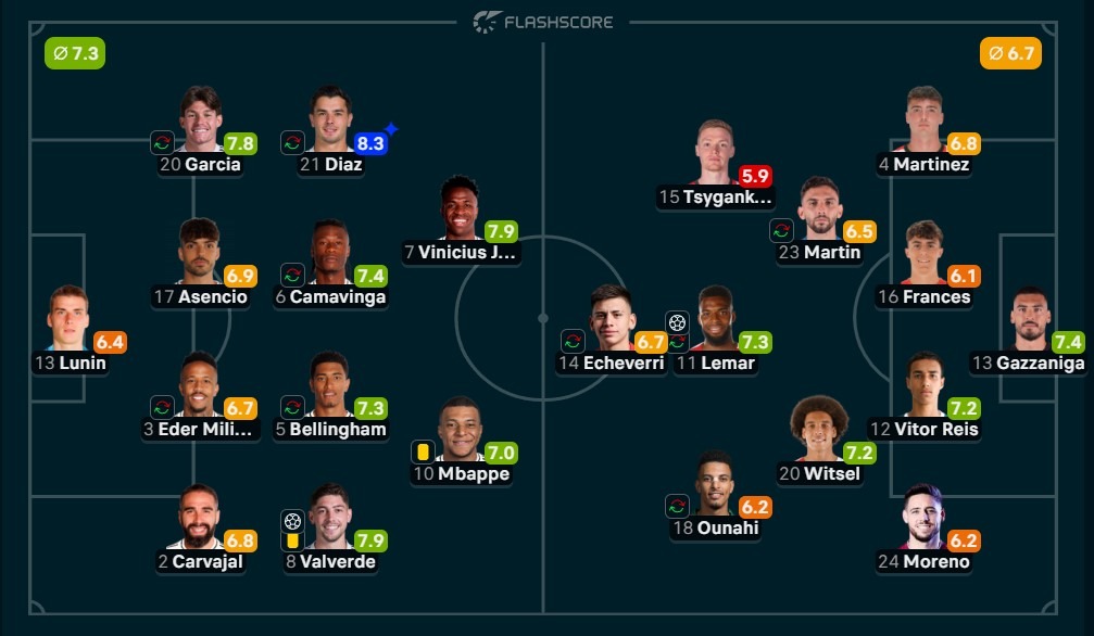 Lunin; Carvajal, Militao, Asencio, Fran Garcia; Valverde, Bellingham, Camavinga, Brahim Diaz; Mbappe, Vinicius Jr