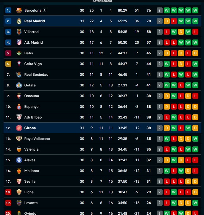 Hasil imbang ini membuat Real Madrid kini mengoleksi 70 poin. Mereka masih tertinggal dari Barcelona yang berada di puncak klasemen.