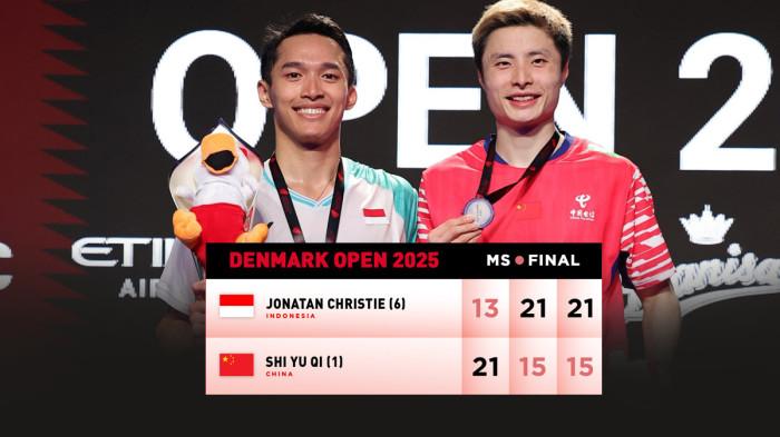 Pebulu tangkis tunggal putra Indonesia, Jonatan Christie, tampil luar biasa di final Denmark Open 2025 dan sukses merebut gelar juara usai menumbangkan unggulan pertama dunia Shi Yu Qi.