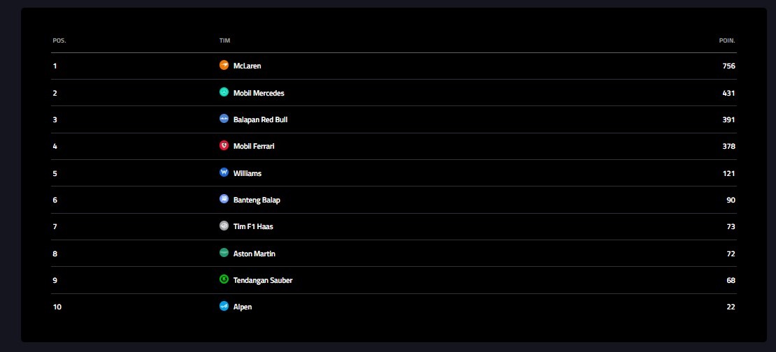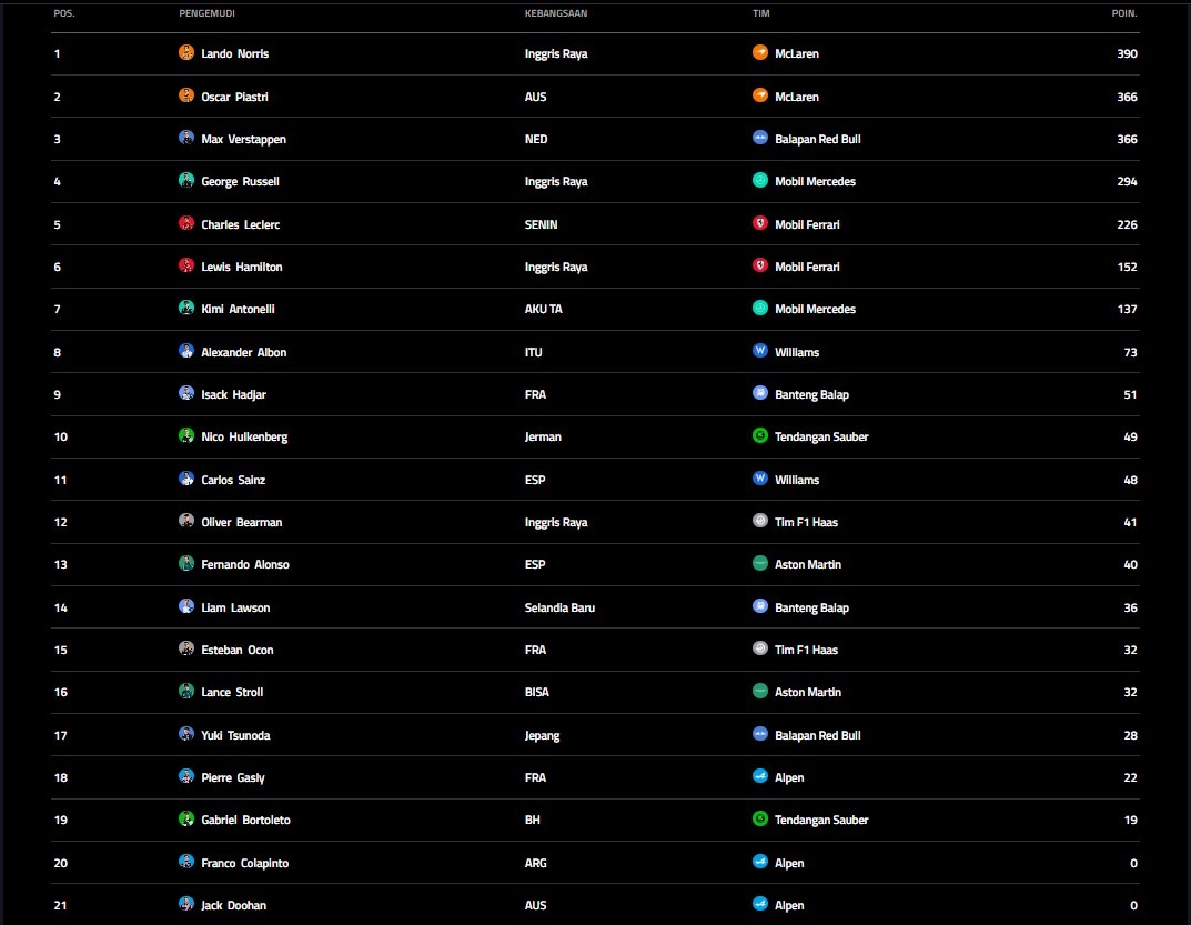 Klasemen Pembalap Formula 1 2025 (Update Pasca Las Vegas)