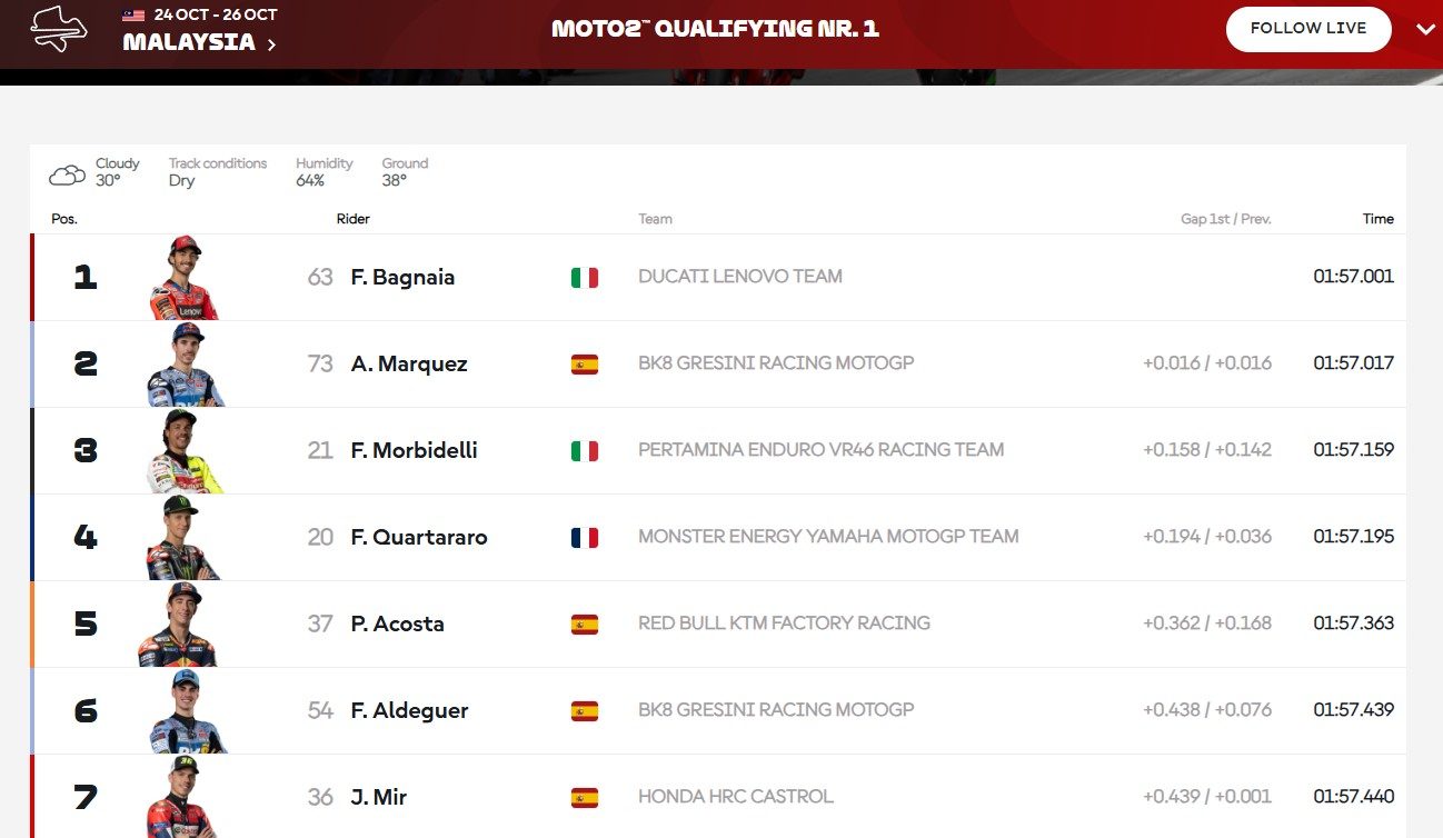 Hasil Lengkap Kualifikasi MotoGP Malaysia 2025