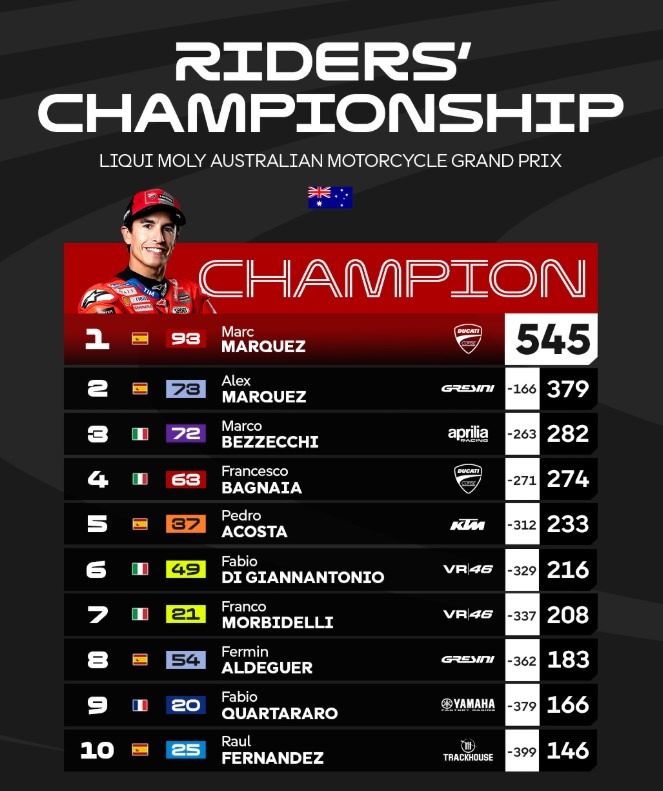 Posisi keempat dan kelima masing-masing ditempati oleh Fabio Quartararo (Monster Energy Yamaha) serta Pedro Acosta (Red Bull KTM Factory Racing), yang kembali menunjukkan performa solid di musim rookie-nya.