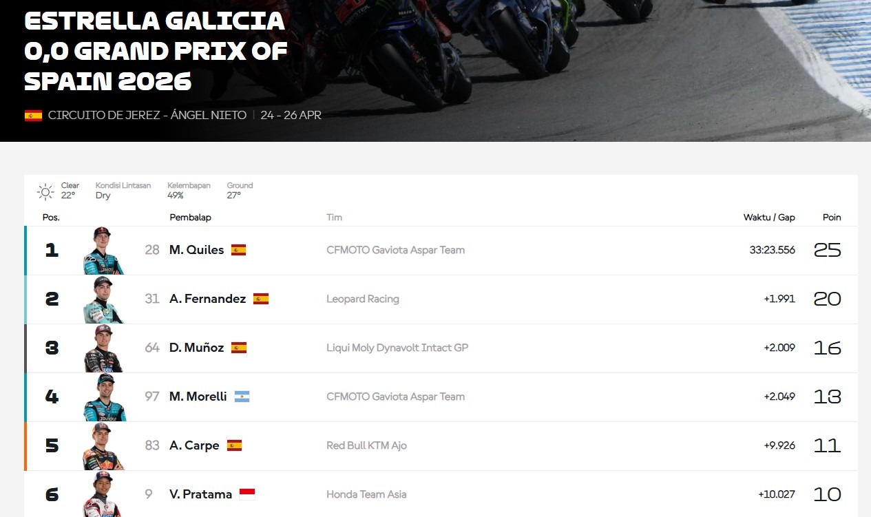 Berkat hasil di Jerez, Veda kini menempati posisi keenam klasemen sementara Moto3 2026 dengan raihan 37 poin.